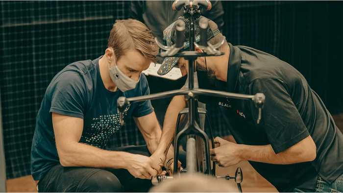 L'approche radicale en matière de conception de l'avant du vélo aboutit à une fourche en une seule pièce, avec une douille de direction externe et un monoriser. Ce que cette solution réalise en une seule pièce nécessiterait normalement des dizaines d'éléments boulonnés et empilés les uns sur les autres.
